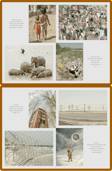 Hier meine Exponate, die ich für die Ausstellung "Verbindungen" gestaltet habe. Fotos mit eigenen Texten, Foto-Collagen am PC, Fotos von einer Papiercollage sowie Acryl auf Leinwand.