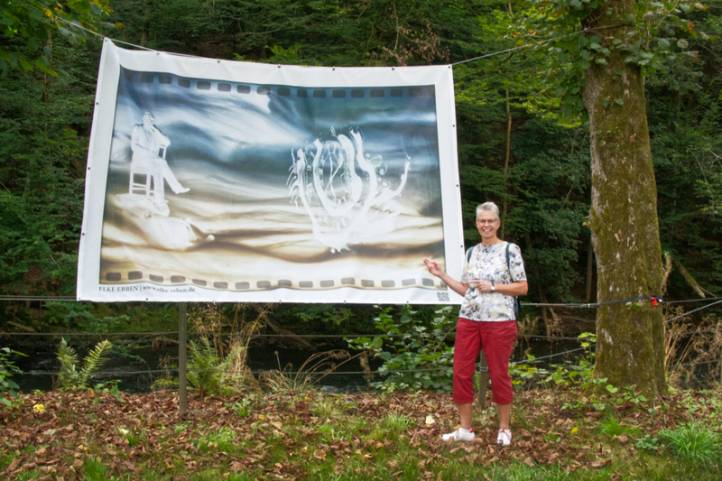Dieses Bild hing bis Ende Oktober 2024 an der Agger hinter dem Rathaus Engelskirchen. Jetzt hängt es bei mir im Garten. Gemeinsam mit elf weiteren Exponaten zum Thema "Sein & Zeit" von anderen Künstler/innen.
